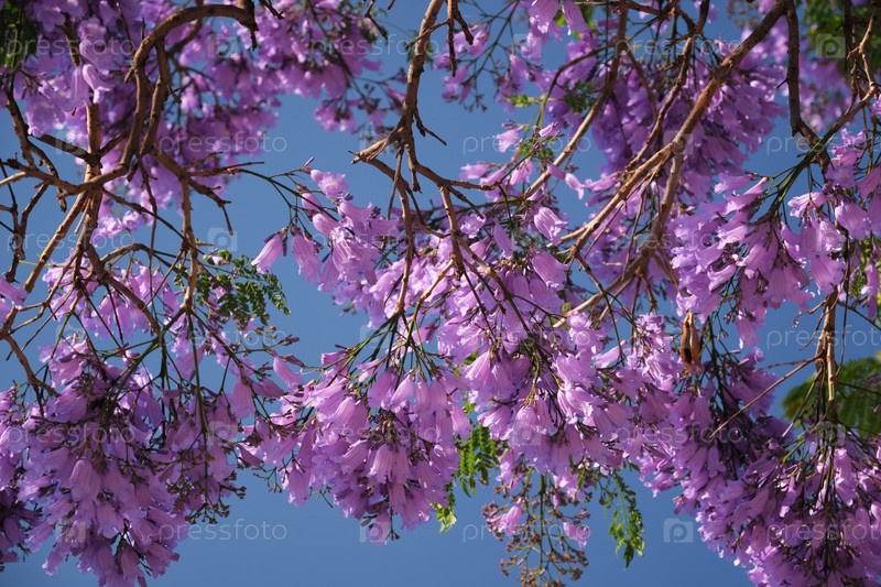 Дерево Джакаранды в полном цветении с фиолетовыми цветками на фоне глубокого синего неба