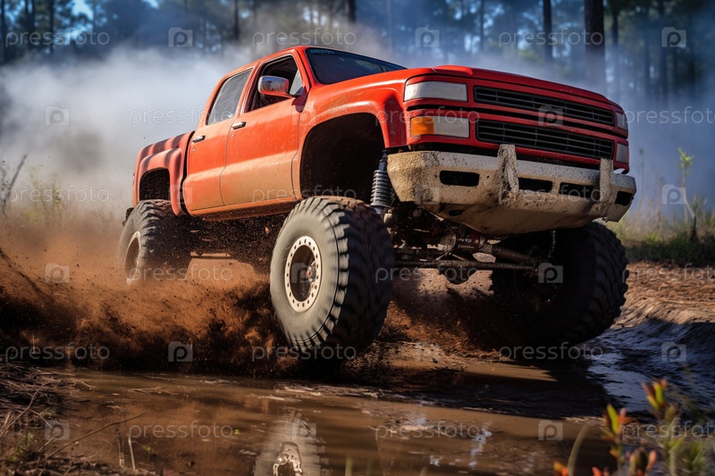 Чудовищный грузовик едет на открытом воздухе среди облака пыли - волнение и адреналин открытого внедорожного гоночного мероприятия
