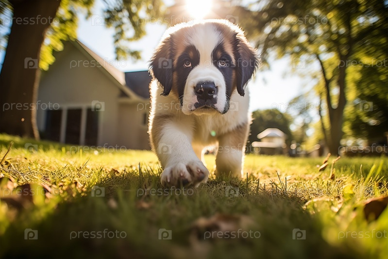 Любопытный щенок Святого Бернарда, исследующий на улице