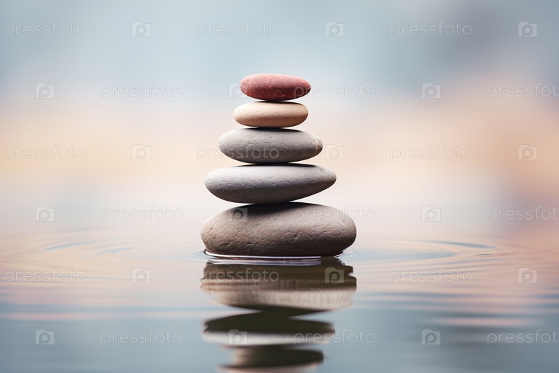 Куча дзен-камней на воде с естественным фоном. изображение передает ощущение равновесия, гармонии и мира. подходит для использования в концепциях исцеления, терапии и релаксации
