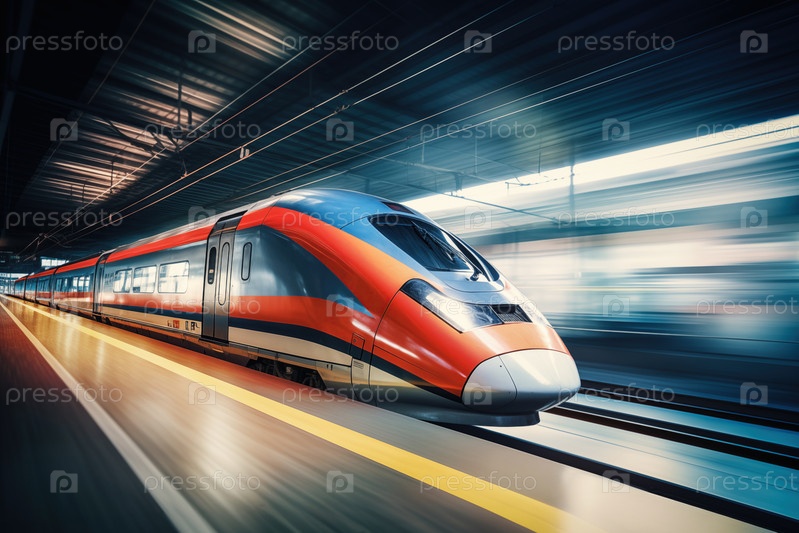 Современный высокоскоростной поезд на футуристической станции.Современные транспортные технологии, скорость, концепции путешествий.Железная дорога с эффектом размытия движения