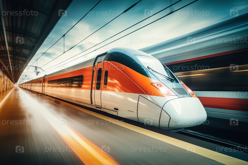 Современный высокоскоростной поезд на футуристической станции.Современные транспортные технологии, скорость, концепции путешествий.Железная дорога с эффектом размытия движения