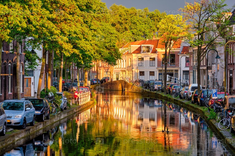 Делфтский канал со старыми домами и машинами, припаркованными на закате