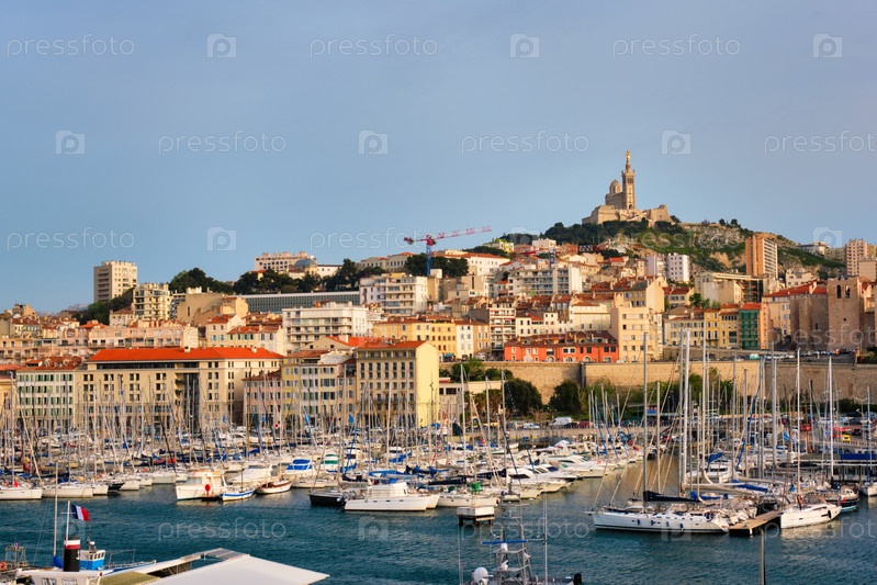 Старый порт Марселя с яхтами и базиликой Нотр-Дам де ла Гард