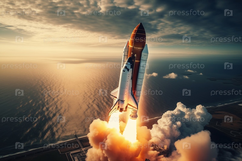 Вид с воздуха запуска ракеты на рассвете над побережьем океана