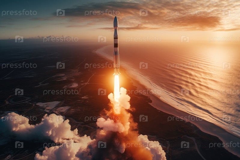 Вид с воздуха запуска ракеты на рассвете над побережьем океана