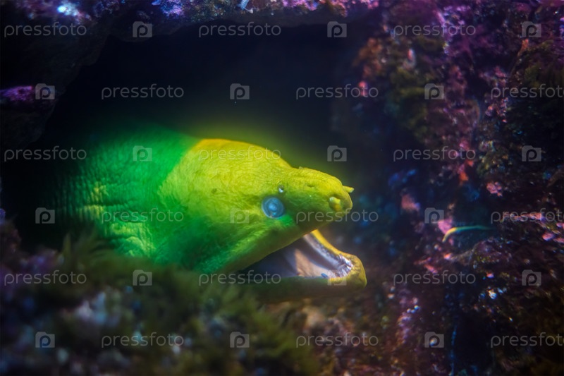 Моряки Muraenidae рыба под водой в море с кораллами на заднем плане