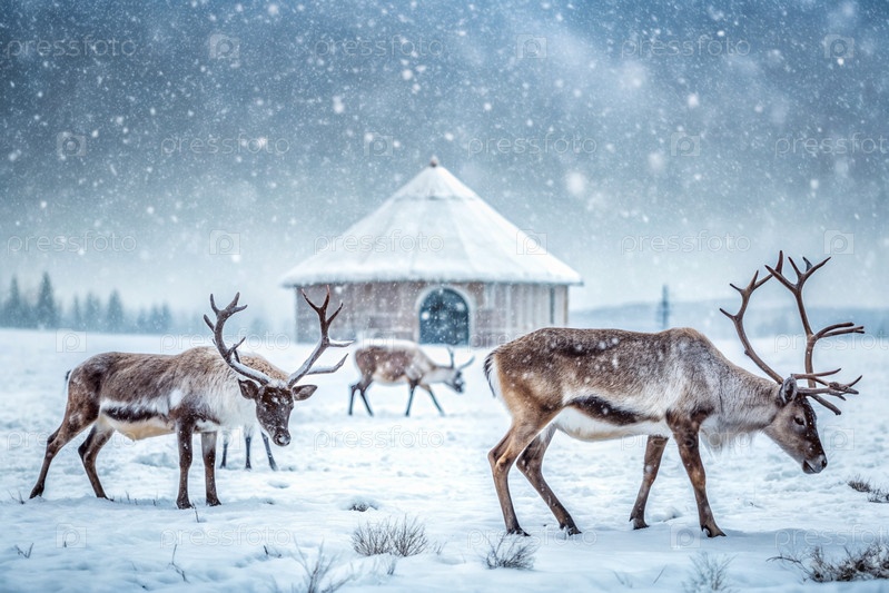 Олени пасутся против тундрового ландшафта и зимней юрты