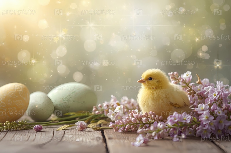 Пасхальные яйца, желтая курица и весенние цветы на деревянном фоне. Концепция яркого пасхального праздника в 2026 году
