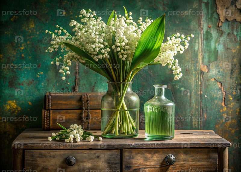 Красивые лилии весенней долины в винтажной стеклянной вазе на старом деревянном шкафу. Букет цветов в вазе во внутреннем доме. Зеленый, коричневый цветный фон