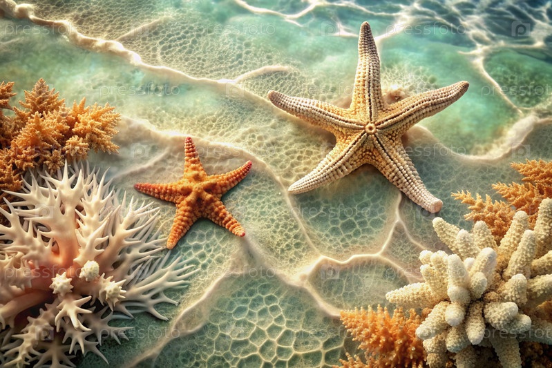 Концепция летних каникул. Подводный мир. Кораллы и морские звезды под водой. Красивый абстрактный фон для баннера