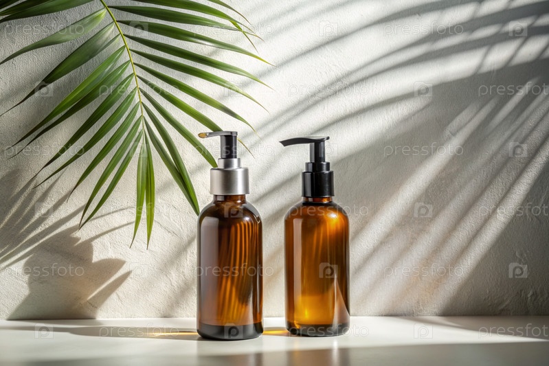 Ароматерапия.Стеклянная бутылка с пипетой для масла, лосьона и пальмовых листьев на бетонном фоне.Натуральная органическая экокосметика.Модель корпоративного стиля салона красоты