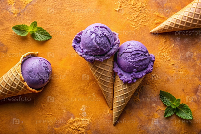 Сладкий десерт. Стильная современная концепция. Фиолетовый конус мороженого на ярко-оранжевом фоне. Всемирный день мороженого