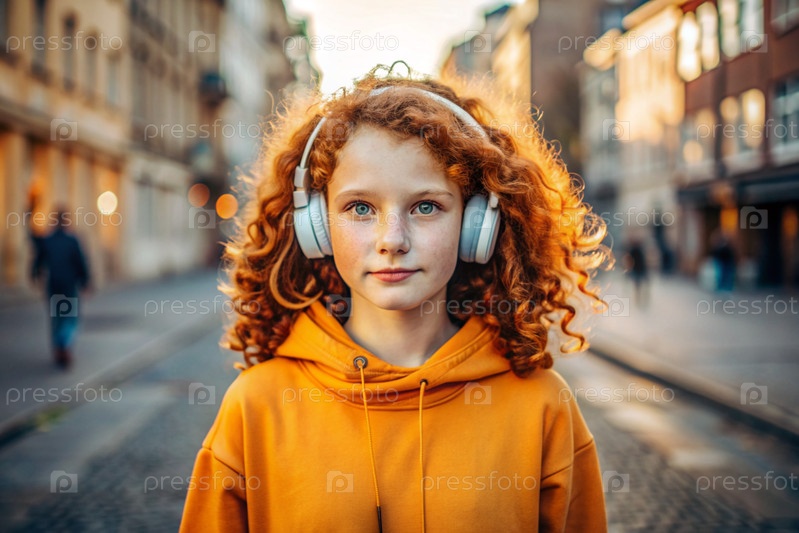 Молодая красивая кудрявая женщина слушает музыку с наушниками на вечерней улице города при закате солнца.Мир, гармония, отдых и расслабление