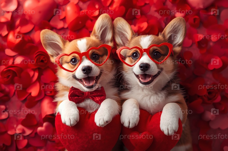 Красивый баннер на День святого Валентина с влюблёнными собаками и красным сердцем. Вид сверху. Романтическая и любящая атмосфера