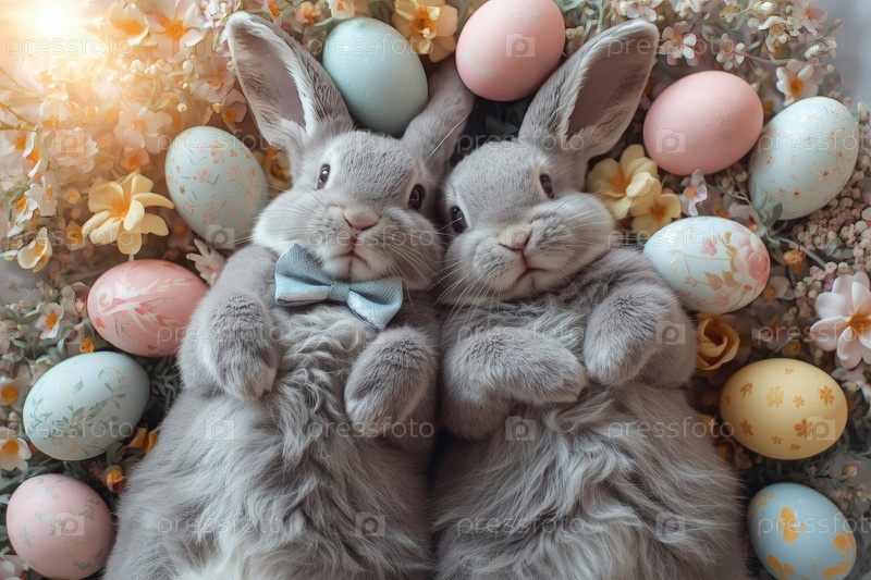 Пасхальные кролики лежат на пасхальных яйцах и смотрят в камеру