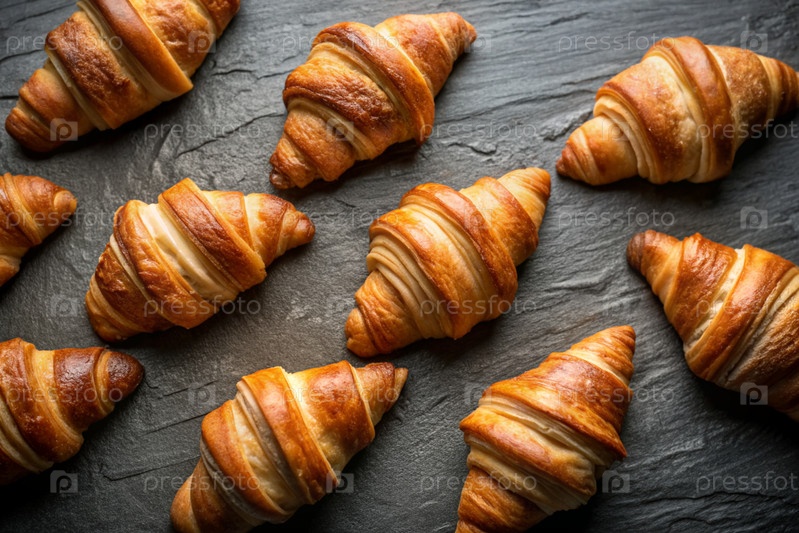 Вкусные свежевыпеченные кроассанты на тёмном фоне сланца. французский завтрак. хорошие ближневые выпечки. пекарня со вкусным хлебом. кондитерские изделия