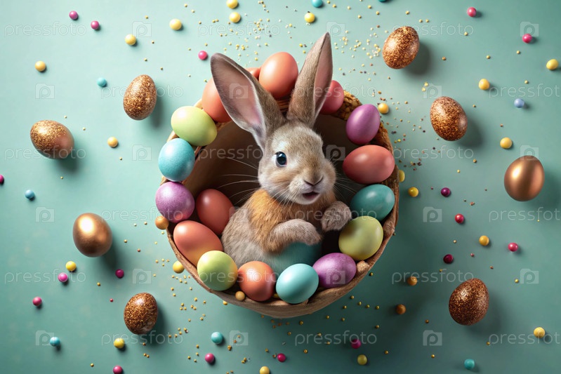 Известный праздник. милый пасхальный кролик заглядывает из ямы с красочными яйцами вокруг. концепция счастливой Пасхи