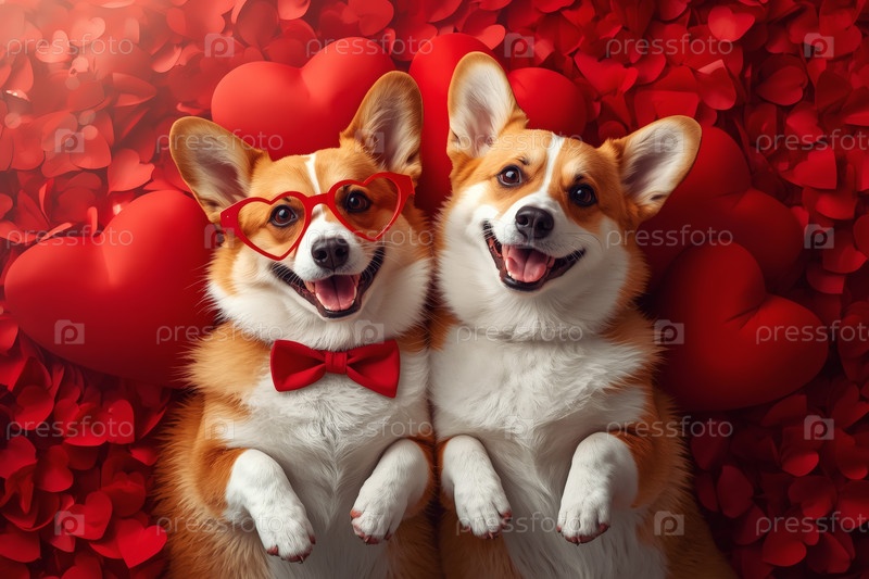 Красивый баннер на День святого Валентина с влюблёнными собаками и красным сердцем. Вид сверху. Романтическая и любящая атмосфера