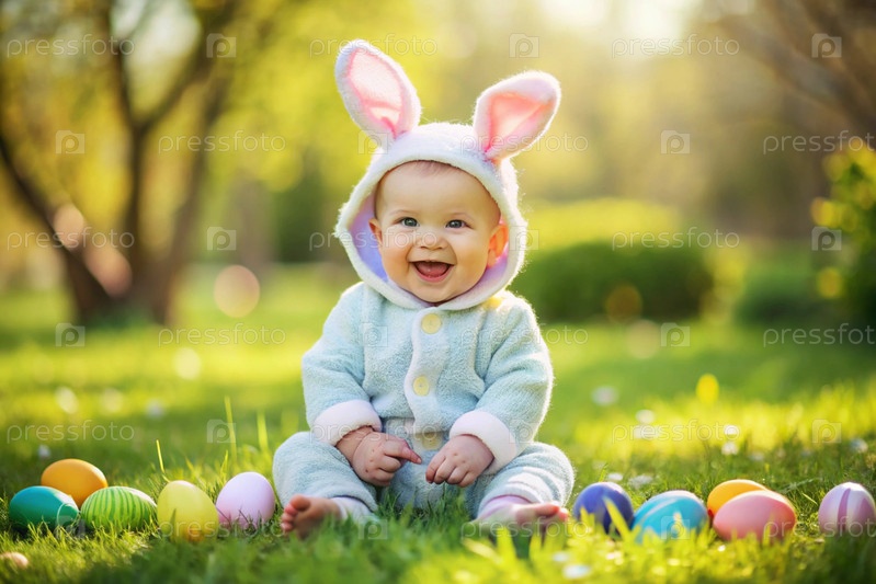 Баннер. Винтажная открытка. Мальчик в костюме пасхального кролика с милыми ушами. Концепция праздника Bright Easter Spring