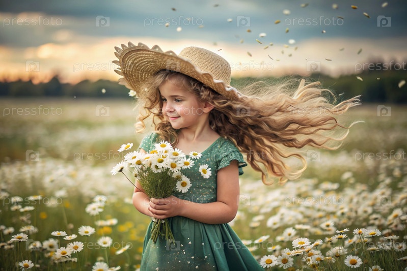 Всероссийский день семьи, любви и верности Красивая маленькая кудрявая девочка в соломенной шляпе с букетом ромашки на фоне поля. День святого Валентина Петра и Февронии