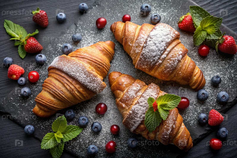 Вкусные свежевыпеченные кроассанты и ягоды на тёмном фоне сланца. французский завтрак. хорошие блинчики для выпечки. пекарня со вкусным хлебом. кондитерские изделия