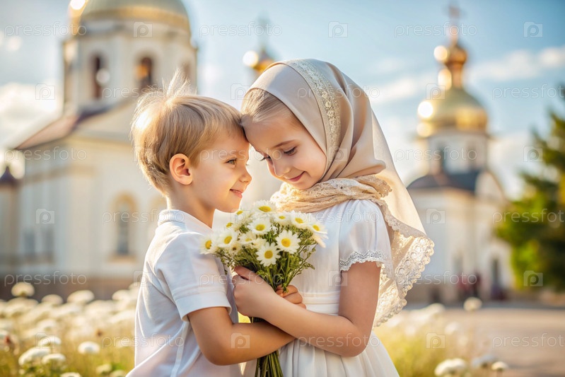 Всероссийский день семьи, любви, верности. милый мальчик и девочка с букетом ромашек на фоне православной церкви. День святого Валентина Петра и Февронии. религия, христианство
