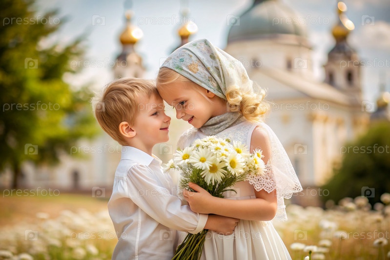 Всероссийский день семьи, любви, верности. милый мальчик и девочка с букетом ромашек на фоне православной церкви. День святого Валентина Петра и Февронии. религия, христианство