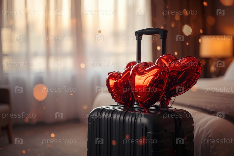 Балонный чемодан в форме сердца в гостиничном номере, чтобы отпраздновать День святого Валентина.Романтический праздник для двух любовников, действие 14 февраля