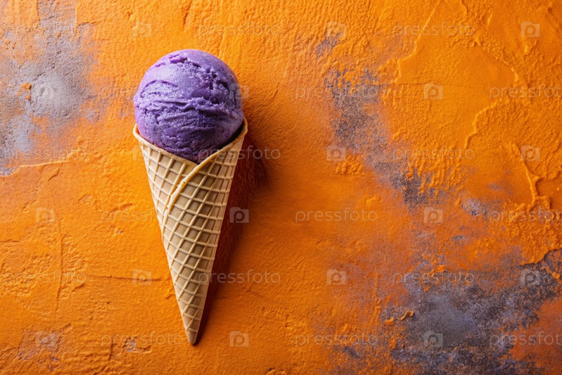 Сладкий десерт. Стильная современная концепция. Фиолетовый конус мороженого на ярко-оранжевом фоне. Всемирный день мороженого