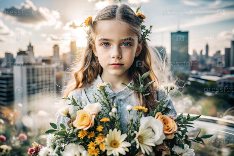 Портрет молодой девушки. концептуальный художественный крупнометражный снимок на фоне городского фона с двойной экспозицией и визуальными эффектами