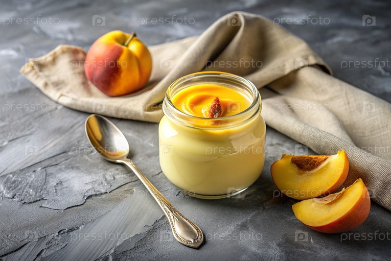 Домашний персиковый йогурт со свежими персиками, винтажной ложкой и полотенцем на стильном сером фоне