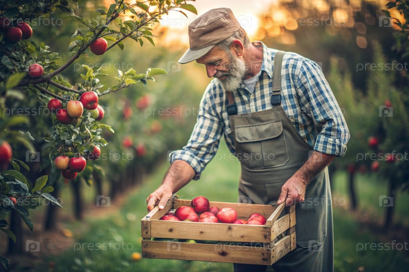 Сельскохозяйственная промышленность. Деревянный ящик с яблоками в руках фермера-мужчины. Садовник собирает богатый урожай. Ближе, солнечный свет. Осенний плодовый сбор