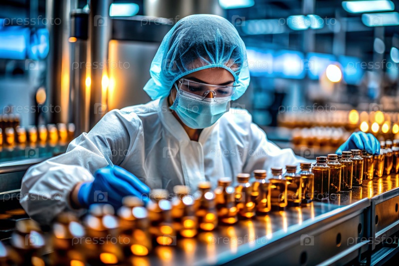 Производство лекарств: фармацевт тестирует медицинские флаконы на автоматическом трубопроводе фармацевтической производственной линии с использованием искусственного интеллекта