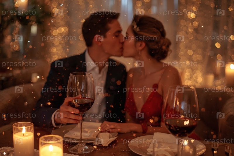 Концепция Дня святого Валентина: элегантная пара, целующаяся на романтическом ужине при свечах с бокалами вина в роскошный вечер