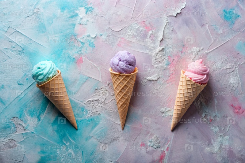 сладкий десерт. морозильные шишки разных вкусов. синий, розовый и фиолетовый мороженое на фоне трех пастельных цветов: синего, розового и фиолетового