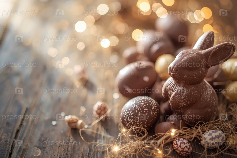 Концепция ярких пасхальных праздников в 2026 году. Красивая открытка. Баннер. Шоколадные пасхальные яйца и шоколадное зайцо на деревянном фоне. Пасхальные сладости и лакомства