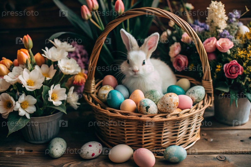 Баннер. пасхальный кролик в плетеновой корзине, наполненной красочными пасхальными яйцами. концепция весенних праздников Пасхи