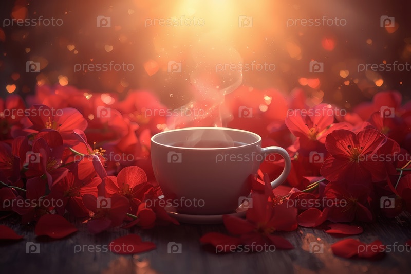 Чашка горячего кофе или чая, окруженная красными цветами и сердцами в День святого Валентина