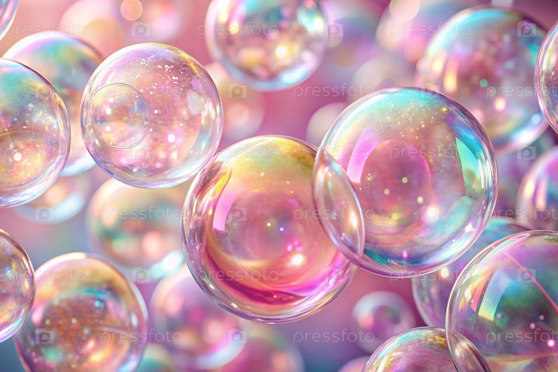 Баннер. Праздничный фон с мерцающими, блестящими, мерцающими прозрачными мыльными пузырями. Красивая сторона