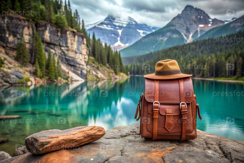 Стильный коричневый кожаный рюкзак и шляпа на фоне живописного озера и гор