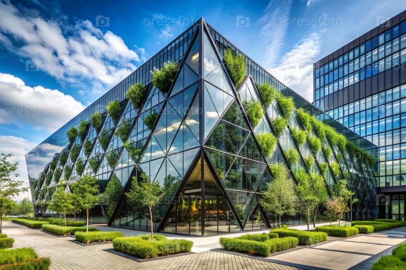 Современная городская экология. Снижение выбросов углекислого газа в городе. Экологически чистое стильное здание с посаженными зелеными растениями для нормализации содержания кислорода в воздухе