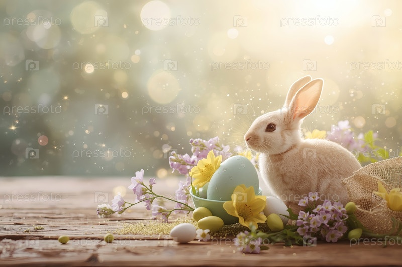 Пасхальные яйца, пасхальный кролик и весенние цветы на деревянном фоне. Концепция яркого праздника Пасхи в 2026 году. Хорошая открытка. Баннер