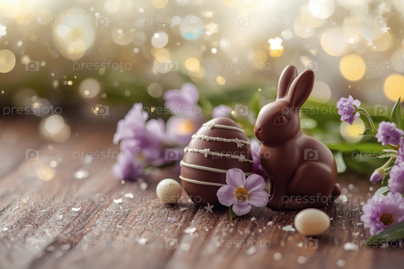 Концепция ярких пасхальных праздников в 2026 году. Хорошая открытка. Баннер. Шоколадные пасхальные яйца, шоколадный кролик и весенние цветы на деревянном фоне. Пасхальные сладости и угощения