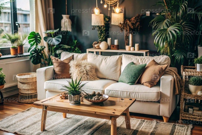 Современный дизайн интерьера гостиной со стильным диваном и кофейным столом, растениями, пальмами и личными аксессуарами для плакатов