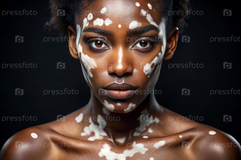Лейкодермия. Витилиго. Плохая пигментация кожи. Большие белые пятна по всему телу и лицу. Портрет красивой девушки с кожными заболеваниями