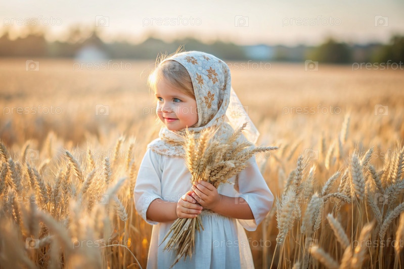Русская девушка в белом платье и русском шале держит золотые колосья пшеницы на фоне созревающего поля. Концепция посадки и сбора богатого урожая. Сельский пейзаж