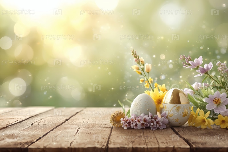 Пасхальные яйца, видео и весенние цветы на деревянном фоне. Концепция яркого пасхального праздника в 2026 году. Хорошая открытка. Баннер