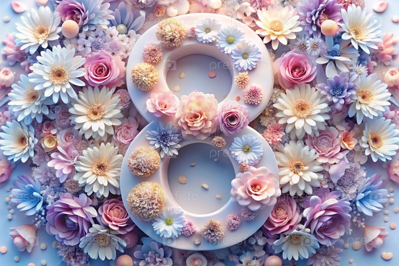 Международный женский день. Баннер, флаер. Праздничный, нежный цветочный фон в голубых и розовых тонах с номером 8
