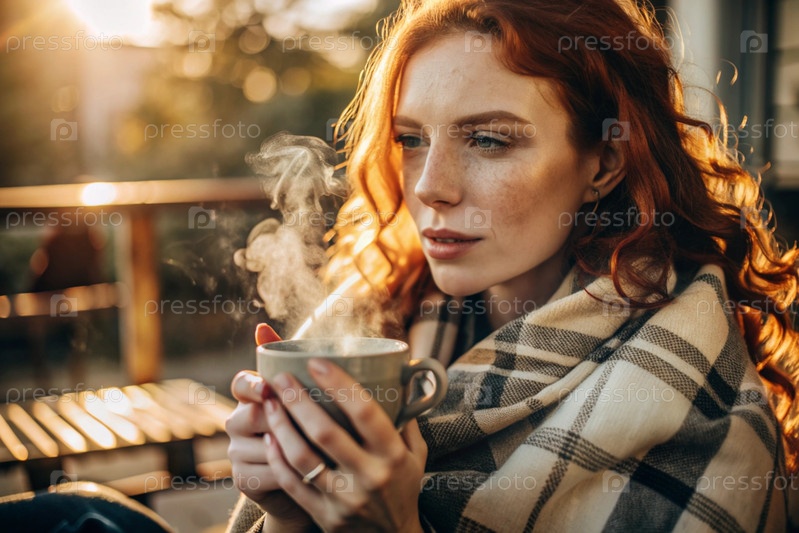 Осенняя ночь. Красивая рыжеволосая женщина, завернутая в клетку с кружкой горячего кофе на красивом террасе под лучами заходящего солнца. Девушка вдыхает аромат напитка. Романтика, комфорт и гармония